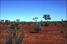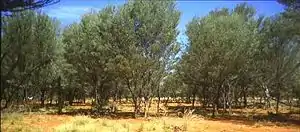 Mulga scrub is distinctive and widespread, with the Mulga Lands of eastern Australia defined as a specific bioregion. The dominant species in these woodlands is mulga, with poplar box (Eucalyptus populnea) forming an increasingly important codominant in the eastern districts.[5][6] The extent of ground cover in mulga woodlands varies with canopy density of the overstorey, becoming almost nonexistent in extremely dense stands. In more open stands, the herbaceous layer consists of wire grasses (Aristida spp.)mulga is long-lived, mulga oats (Monocather sp.), mulga mitchell (Thyridolepis sp.), wanderrie (Eriachne spp.), finger grasses (Digitaria spp.) and love grasses (Eragrostis spp.). Various other woody species are also significant in mulga woodlands, particularly hop bushes (Dodonaea spp.), Eremophila and cassia (Senna spp.).[4][6]