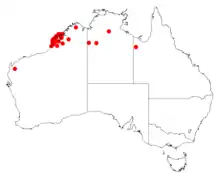 It is native to an area in the Kimberley region of Western Australia where it is commonly situated on undulating plains, rocky hills and ranges where it grows in red sandy or skeletal soils over quartzite or sandstone.[1] The bulk of the population is found in coastal areas of the west Kimberley from around the Dampier Peninsula, on the Buccaneer and Bonaparte Archipelagoes in the north down to around Thangoo Station in the south where it is usually part of in woodland and shrubland communities sometimes in seepage areas.[2]