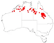 It is native to a small area in the Kimberley region of Western Australia where it is found on flats and plains growing in sandy soils over and around quartzite and sandstone.[1] Its range extends eastwards into tropical parts of the top end in the north east of the Northern Territory and the far north west of Queensland where it is often part of open Eucalyptus forest communities.[2]