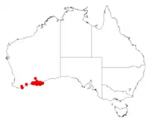 It is native to an area along the south coast in the Goldfields-Esperance region of Western Australia where it is commonly situated on flat or undulating sandplains or along the margins of salt lakes growing in sandy soils over or around limestone[1] or sandy-loamy, clay or gravelly soils The bulk of the population is found from around Young River in the west to around Israelite Bay in the east and extending as far north as 130 km (81 mi) where it is often a part of open shrub mallee over heathland communities.[2]