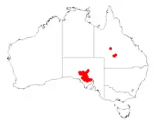 It is endemic to southern parts of central South Australia from the northern parts of the Eyre Peninsula in the south to around areas to the west of the Gawler Range and to just north of Tarcoola where it is usually situated on rocky hillsides and ridges that are composed of granite as a part of open and tall shrubland or low woodland communities.[1] It is often associated with other species of Acacia including Acacia aneura, Acacia cibaria and Acacia papyrocarpa growing in shallow compact loamy soils and alkaline red duplex and brown calcareous soils in areas where the average rainfall is 200 to 350 mm (7.9 to 13.8 in) per annum.[2]