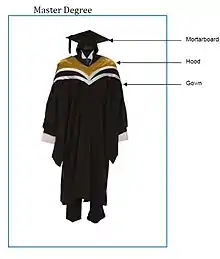 Academic dress is a traditional form of clothing for academic settings, mainly tertiary (and sometimes secondary) education, worn mainly by those who have obtained a university degree (or similar), or hold a status that entitles them to assume them (e.g., undergraduate students at certain old universities).[1] It is also known as academical dress,[2] academicals, subfusc and, in the United States, as academic regalia.