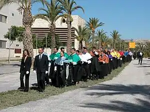 The professorial Talar can be described as a long black gown with wide sleeves, often with lapels in faculty colour, while deans wear a Talar completely in faculty colour. Rectors typically have a distinguished, more elaborate Talar, e.g., made of velvet, coloured in red, or with gold embroidery.[18][19] At some universities, the rector additionally wears a chain of office and, at some occasions, carries a scepter.[20][21] The cap that accompanies the Talar is called Barett. As is the case with the Talar, which type of cap is used varies by university as well. Historically, caps made of soft materials rather than the square academic cap are common. The colour of the Barett matches the Talar.[19]