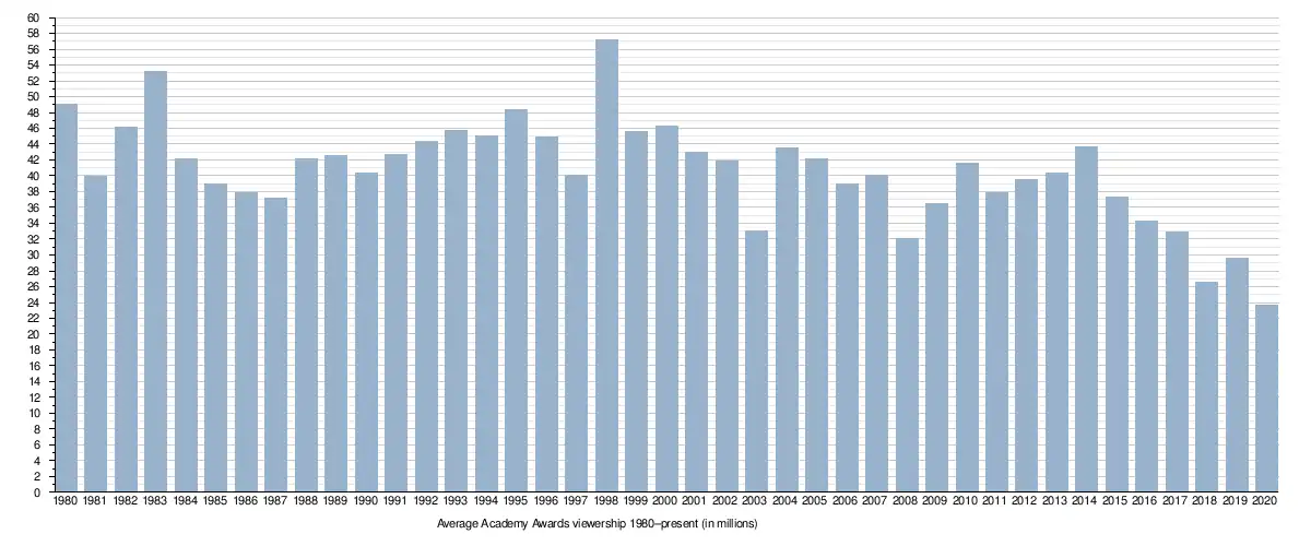 Historically, the telecast's viewership is higher when box-office hits are favored to win the Best Picture award. More than 57.25 million viewers tuned to the telecast for the 70th Academy Awards in 1998, the year of Titanic, which generated a box office haul during its initial 1997–98 run of US$600.8 million in the US, a box office record that would remain unsurpassed for years.[81] The 76th Academy Awards ceremony, in which The Lord of the Rings: The Return of the King (pre-telecast box office earnings of US$368 million) received 11 Awards including Best Picture, drew 43.56 million viewers.[82] The most watched ceremony based on Nielsen ratings to date, however, was the 42nd Academy Awards (Best Picture Midnight Cowboy) which drew a 43.4% household rating on April 7, 1970.[83]