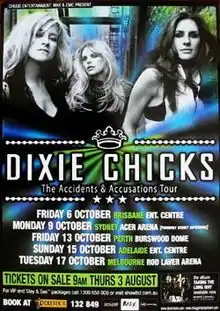 The Accidents & Accusations World Tour was a concert tour by the Dixie Chicks. It was their first tour where tickets were sold after the scandal which ensued in 2003 when lead singer Natalie Maines publicly criticized President George W. Bush at Shepherd's Bush Empire in London during the Top of the World Tour, leading to intense criticism of the group. Consequently, the level of commercial success for the tour attracted considerable media attention. The tour was named after the lyrics in the song "Easy Silence" from the album Taking the Long Way, released a few weeks earlier in 2006.