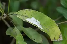 Its wings are typically white with a creamy tinge. Markings pale brown. Fasciae of forewing diffuse and obscure. Hingwing angle characterize by a black fleck and smaller flecks on either side. Caterpillar fusiform (spindle shaped), whereas head is round and narrow. Body translucent green with a dark dorsal line. Body skin polished and glossy in appearance with setae on tubercles. Pupa claviform and cremaster contain a pair of hooked shafts. Pupation occurs in a cocoon on the upper surface of leaf.[3] Host plant is Dregea species.[4]