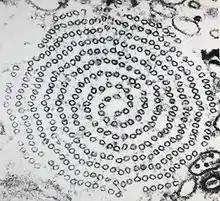 The most distinctive characteristic of the actinophryids is their axopodia. These axopodia consist of a central, rigid rod which is coated in a thin layer of ectoplasm. In Actinophrys the axonemes end on the surface of the central nucleus, and in the multicellular Actinosphaerium they end at or near nuclei.[5] The axonemes are composed microtubules arranged in a double spiral pattern characteristic of the order.[8] Due to their long, parallel construction these microtubules demonstrate strong birefringence.[9][10]