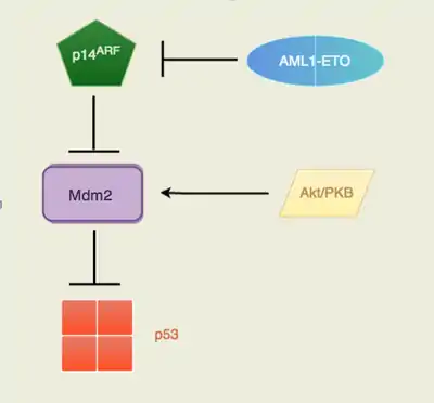 The fusion oncoprotein involves the gene AML1 (now known as RUNX1) and ETO (now known as RUNX1T1). AML1, located at the 21q22, normally has the ability to activate transcription of the ARF gene and ETO, located at the 8q22, normally has the ability to repress transcription. The fusion protein AML1-ETO is commonly found in acute myeloid leukemia patients. p14ARF is a well known tumor suppressor that serves as the safety net when p53 tumor suppressor's functions are inhibited. Many cancers recognize the potential of the p14ARF tumor suppressor to block cell growth so it is commonly mutated or inhibited in cancer cells. The AML1-ETO is incapable of p14ARF transcription as the fusion protein took on AML1's involvement with ARF gene expression and ETO's transcription repression. The Akt/PKB signaling is a pathway that is pro-survival and growth. By activating Mdm2, the signal transduction pathway will trigger the anti-apoptotic downstream effects of Mdm2. With no p14ARF to regulate and inhibit Mdm2, there will be an increased level of suppression of p53. Mdm2 is a proto-oncogene that directly antagonizes p53 to ubiquitination (Figure 1). The p53 protein is known as the “guardian of the genome” due to its ability to induce DNA repair enzymes and regulate cell cycle advancements. The down regulation of p53 by Mdm2 would lead to unchecked proliferative growth. The direct consequence of having the fusion protein, AML1-ETO, is the lack of p53 regulation in pre-leukemic cells. Therefore, there are an increased number of immature cells that are unable to carry out normal function, which is essentially cancer (Faderi et al., 2000, Song et al. 2005, Weinberg, 2014).