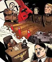 Apart from Hollywood films, Hitler was the subject for several comic book superheroes who battled Hitler directly or indirectly in comics published during World War II. Superheroes that fought Hitler include Superman, Captain America, the Shield, and Namor the Sub-Mariner. The first Captain America comic showed Captain America hitting Hitler on the jaw. Captain America's archenemy, the Red Skull, was established as being an apprentice to Hitler. In Superman #15 the dictator Razan appeared, who attempted to invade a nearby democratic nation. Superman defeated his army, and Razan was shot while trying to escape.