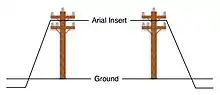 In telecommunications an aerial insert is a segment of cabling that rises from ground to a point above ground, followed by an overhead run, e.g. on poles, followed by a drop back into the ground. An aerial insert is used in places where it is not possible or practical to place a cable underground. Aerial inserts might be encountered in crossing deep ditches, canals, rivers, or subway lines.[1]
