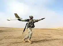 The RQ-11 Raven was originally introduced as the FQM-151 in 1999, but in 2002 developed into its current form,[3] resembling an enlarged FAI class F1C free flight model aircraft in general appearance. The craft is launched by hand and powered by a pusher configuration electric motor. The plane can fly up to 6.2 miles (10.0 km) at altitudes of appx 500 feet (150 m) above ground level (AGL), and over 15,000 feet (4,600 m) above mean sea level (MSL), at flying speeds of 28–60 mph (45–97 km/h).[4] The U.S. Army deploys the Raven at company-level.[5]