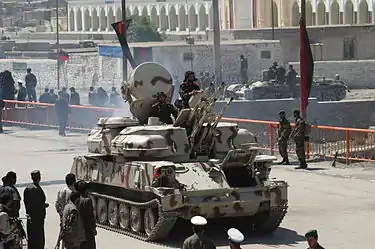 In the early 1970s, Soviet military assistance was increased. The number of Soviet military specialists increased from 1,500 in 1973 to 5,000 by April 1978.[19] The senior Soviet specialist at this time (from 29.11.1972 till 11.12.1975) was a Major General I.S. Bondarets (И.С. Бондарец), and from 1975 to 1978, the senior Soviet military adviser was Major General L.N. Gorelov. Before the 1978 Saur Revolution, according to military analyst George Jacobs, the Army included "some three armored divisions (570 medium tanks plus T 55s on order), eight infantry divisions (averaging 4,500 to 8,000 men each), two mountain infantry brigades, one artillery brigade, a guards regiment (for palace protection), three artillery regiments, two commando regiments, and a parachute kandak (battalion), which was largely grounded. All the formations were under the control of three corps level headquarters. All but three infantry divisions were facing Pakistan along a line from Bagram south to Khandahar."[20]