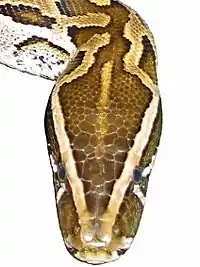 The African rock python's body is thick and covered with colored blotches, often joining up in a broad, irregular stripe. Body markings vary between brown, olive, chestnut, and yellow, but fade to white on the underside.[6][12] The head is triangular and is marked on top with a dark brown “spear-head” outlined in buffy yellow. Teeth are many, sharp, and backwardly curved.[5][12] Under the eye, there is a distinctive triangular marking, the subocular mark.[6] Like all pythons, the scales of the African rock python are small and smooth.[12][23] Those around the lips possess heat-sensitive pits, which are used to detect warm-blooded prey, even in the dark.[5][23][24] Pythons also possess two functioning lungs, unlike more advanced snakes, which have only one, and also have small, visible pelvic spurs, believed to be the vestiges of hind limbs.[23][24]