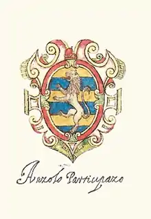 Agnello Participazio (Latin: Agnellus Particiacus) was the tenth traditional and eighth (historical) doge of the Duchy of Venetia from 811 to 827. He was born to a rich merchant family from Heraclea and was one of the earliest settlers in the Rivoalto group of islands. His family had provided a number of tribuni militum of Rivoalto. He owned property near the Church of Santi Apostoli.[1] A building in the nearby Campiello del Cason was the residence of the tribunes.[2] Agnello was married to the dogaressa Elena.[3]