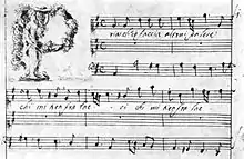 Steffani did not accompany the elector George to England, but in 1724 the Academy of Vocal Music in London elected him its honorary president for life. In return for the compliment he sent the association a Stabat Mater, for six voices and orchestra, and three madrigals. The manuscripts of these are still in existence, and the British Library possesses a Confitebor, for three voices and orchestra, of about the same period. All these compositions are in advance of the age in which they were written, and in his operas Steffani shows an appreciation of the demands of the stage, noted as remarkable during a period at which the musical drama was gradually approaching the character of a merely formal concert, with scenery and dresses. But for the manuscripts at Buckingham Palace, these operas would be unknown. Steffani is remembered for his chamber duets, which, like those of his contemporary Carlo Maria Clari (1669–1745), are chiefly written in the form of cantatas for two voices, accompanied by a figured bass. The British Library (Add MS 5055-5056) possesses more than a hundred of these compositions, some of which were published at Munich in 1679. Steffani visited Italy for the last time in 1727, in which year Handel, who always gratefully remembered the kindness he had received from him at Hanover, once more met him at the palace of Cardinal Ottoboni in Rome. This was the last time the two composers met. Steffani returned soon afterwards to Hanover, and died on 12 February 1728 while engaged in the transaction of some diplomatic business at Frankfurt.[2]