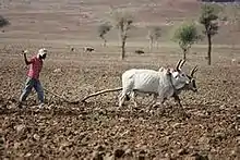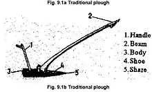Almost all farming tools in Ethiopia are traditional and made from different types of wood.[28] These tools includes sickle, pick axe, plough shaft, ploughshare, plow, beam and animal force as a machines. The plough shaft, beam and ploughshare are made of wood and the sickle, pick axe, plow are made of metal. Ploughing the land using these tools is ambiguous and time-consuming.