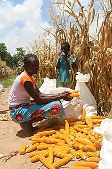 Agriculture in Ghana consists of a variety of agricultural products and is an established economic sector, and provides employment on a formal and informal basis.[1][2] Ghana produces a variety of crops in various climatic zones which range from dry savanna to wet forest and which run in east–west bands across Ghana. Agricultural crops, including yams, grains, cocoa, oil palms, kola nuts, and timber, form the base of agriculture in Ghana's economy. In 2013 agriculture employed 53.6% of the total labor force in Ghana.[3][4]