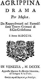 Agrippina (HWV 6) is an opera seria in three acts by George Frideric Handel with a libretto by Cardinal Vincenzo Grimani. Composed for the 1709–10 Venice Carnevale season, the opera tells the story of Agrippina, the mother of Nero, as she plots the downfall of the Roman Emperor Claudius and the installation of her son as emperor. Grimani's libretto, considered one of the best that Handel set, is an "anti-heroic satirical comedy",[1] full of topical political allusions. Some analysts believe that it reflects Grimani's political and diplomatic rivalry with Pope Clement XI.