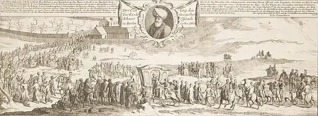 Ahmed Resmî Efendi (English, "Ahmed Efendi of Resmo"), also called by some Arabic sources as Ahmed bin İbrahim Giridî ("Ahmed the son of İbrahim the Cretan"), was an Ottoman Greek[2] statesman, diplomat and author of the late 18th century. In international relations terms, his most important - and unfortunate - task was to act as the chief of the Ottoman delegation during the negotiations and the signature of the Treaty of Küçük Kaynarca.[1] In the literary domain, he is remembered for various works among which his sefâretnâme recounting his embassies in Berlin and Vienna occupy a prominent place. He was Turkey's first ever ambassador in Berlin.