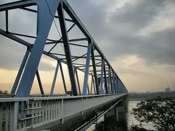 The Aigiōhashi Bridge (愛岐大橋, Aigi ōhashi) is a truss bridge over the Kiso River in Japan. It is an iron beam bridge which connects Kakamigahara in the Gifu Prefecture with Inuyama in the Aichi Prefecture. The bridge is part of Aichi-Gifu Prefectural Route 17, known as the Kōnanseki Route. The bridge is an essential link in the route from Nagoya and Komaki in Aichi Prefecture to Kakamigahara, Seki, and Gujō in Gifu Prefecture. Because there are no other bridges for 4 kilometres (2.5 mi) up- or downstream, the bridge is generally congested all day. The bridge was closed for a time in 1999 for maintenance.