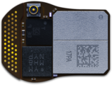 SiP from the bottom, showing the H1 enclosure, the two accelerometers, the Bluetooth antenna connector and the large pad attaching a flex cable to all other components in the headphone