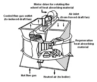 The heating plate elements in this type of regenerative air preheater are also installed in a casing, but the heating plate elements are stationary rather than rotating. Instead the air ducts in the preheater are rotated so as to alternatively expose sections of the heating plate elements to the upflowing cool air.[1][2][3]