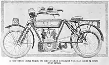 On 7 January 1901 the British engineer Archibald Sharp patented a method for making a seal allowing pneumatic or hydraulic apparatus described as a "rolling mitten seal",[1] and on 11 January 1901 he applied for a patent for the use of the device to provide air suspension on bicycles.[2] Further developments using this 1901 seal followed.[3][4] A company Air Springs Ltd was formed and in 1909 started producing the A.S.L. motorcycle.[5] This was unusual in having pneumatic suspension at front and rear - rear suspension being unusual in any form of motorcycle at that time. The suspension units were similar to the normal girder forks with the spring replaced by a telescopic air unit which could be pressurised to suit the rider. Production of the motorcycles ceased in 1914.