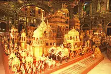On completion, the models were displayed in Museum Hall in Jaipur. A big fair was celebrated for ten days in 1895 A.D which was attended by Maharaja Madhosinghji of Jaipur. The models were thereafter installed in the building behind the main Temple. This Hall is richly painted in variegated colours, and the walls and ceiling are covered with glass mosaic work.[9]