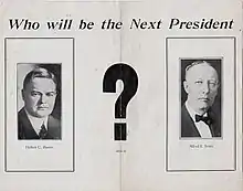 Reporter Frederick William Wile made the oft-repeated observation that Smith was defeated by "the three P's: Prohibition, Prejudice and Prosperity".[9] The Republican Party was still benefiting from an economic boom, as well as a failure to reapportion Congress and the electoral college following the 1920 census, which had registered a 15 percent increase in the urban population. Smith's economic conservatism and anti-prohibition stance likely contributed to his inability to coalesce support amongst rural progressives.[10] Smith's opponent, Republican nominee Herbert Hoover, was vastly popular. Additionally, Hoover was running on the record of an immensely popular incumbent Republican president, Calvin Coolidge.[3] Hoover benefited incredibly from the perception of Republican-led economic prosperity, which, less than a year later, would be proven to have been an illusion.[2]