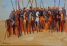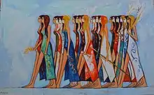 This work, Women Climbing the Ladder, was based on a scene located at the Ramesseum Temple in Luxor, Egypt. By placing this ancient image in a more modern context it demonstrates how instrumental women were in the past and also in the present.[19] Awad painted this piece to represent the role of women and stated the influence of the battle of Kadesh in which it is located. In this court are well preserved scenes from the battle of Kadesh. Ramesses II dashes into battle (lower row). He is depicted larger than his men, and the enemy, mostly dead and wounded, lie in heaps on the ground. The fortress of Kadesh, surrounded by a moat, divides a group of the enemy from the battlefield. These men, far from preparing themselves for battle, are lending a hand to their drowning companions. Though this mural has been considered by some as a pretentious interpretation, there is no doubt that the complexity of the composition shows development and sophistication. The individual figures, however, indicate marked deterioration from the expressive detail of the murals of Seti I's mortuary temple. Egypt has a long long history and its own traditions.[2] This again highlights Awad bringing social issues into the limelight while also reinforcing that Egypt must return to its roots to move ahead.