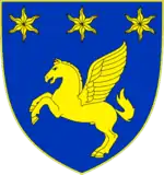 ![]() | Lord Ashfield's Arms: "Azure a Pegasus rampant in chief three Estoiles Or". For supporters on each side of to the shield, Ashfield chose "an Electrical Mechanic, that on the dexter holding in the exterior hand a Coil of Wire and that on the sinister holding in the exterior hand a Pair of Pliers all proper." His Crest was "A Demi Stag proper gorged with a Wreath of Oak Vert resting the sinister foot upon a Bugle Horn Or". His motto was In alta tende (Strive for the Heights).[1] |