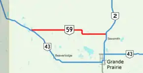 Alberta Provincial Highway No. 59, commonly referred to as Highway 59, is an east–west highway in northwest Alberta, Canada. It runs from Highway 2 north of Sexsmith to Highway 43 northwest of Hythe.[1][2][3]