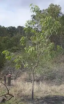 The growth habit of the species is variable, with individuals able to persist and fruit as either a large single stemmed tree to 10 metres,[3] or as a large multi-stemmed shrub.[2] The shrub form appears to develop as a result of coppice regeneration following burning and enables the species to survive in the eucalypt savannas of Northern Australia which are subject to frequent fire.