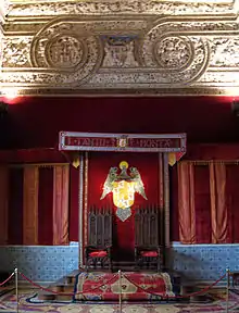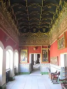 During his visit to Spain known as the "Spanish match", Prince Charles of England visited the Alcázar in 1623, after dining at Valsain.[1] He was entertained by Luis Jerónimo de Cabrera, 4th Count of Chinchón, who was then keeper of the Alcázar. Prince Charles was shown the Galley Room or "second great hall" with the heraldry of Catherine of Lancaster. In the evening there was a torchlit masque involving 32 mounted knights. Prince Charles gave the Count of Chinchón a jewel and rewarded the poet Don Juan de Torres for his verses. He left early in the morning for Santa María la Real de Nieva.[2]