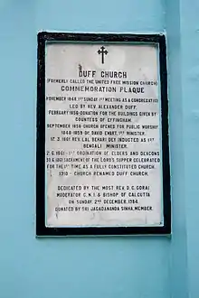 Duff hoped that through a western education in a time of enlightenment, Indians would be able to see the flaws in their religion and be compelled to convert to Christianity, but he did not consider the resilience of the Hindu religion and his efforts proved to be fairly unsuccessful on the broader scale.[14] Educations of the Christian bible was accepted by Hindus because they were confident in their own religion and were not worried that their children would lose their faith. Hinduism was not only a religion but a culture, and the occupation of the British and their ideas was not drastic enough to change this. Because Alexander Duff was regarded well, his character served as a model to his students and friends and his teaching did eventually lead to some reformist movements within Hinduism. In fact, Duff's work led to the acceptance of more Indians into public official positions in government.[14] This experience was critical to the transitional Indian government after Independence in 1947. A Church was established in 1848 and named as Duff Church in 1910 in memory of Alexander Duff.[15]