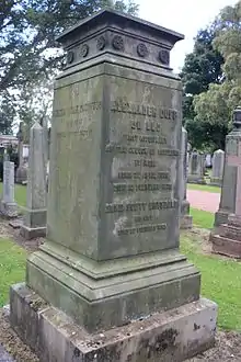 Alexander Duff died in Sidmouth, Devon [10] on 12 February 1878. He is buried with his wife, Ann Scott Drysdale, in the north-east section of the Grange Cemetery in Edinburgh. By his will, he devoted his personal property to found a lectureship on foreign missions at New College (now part of the University of Edinburgh) on the model of the Bampton Lectures.[11]