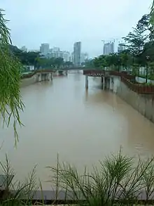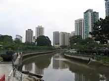 Alexandra Canal is one of the upper reaches of the Singapore River and Sungei Pandan, becoming the Singapore River after Kim Seng Bridge.[1] The 1.2 km long canal stretches from Tanglin Road to Delta Road. Reconstruction of Alexandra Canal between Tanglin Road and Kim Seng Road took place from 1997 to 2008 to improve the structural condition of the canal and to alleviate flooding in the catchment. In 2011, a 250-metre stretch of Alexandra Canal, between Zion Road and Kim Seng Road, was reconstructed to improve drainage and prevent floods.[2] A 200m stretch of the open waterway near Tanglin Road was decked over to create an water cascade and water play area. The deck also provides a point from which the public can have a view of the waterway downstream.