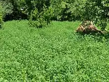 Alfalfa can be sown in spring or fall, and does best on well-drained soils with a neutral pH of 6.8–7.5.[31][32] Alfalfa requires sustained levels of potassium and phosphorus to grow well.[33] It is moderately sensitive to salt levels in both the soil and irrigation water, although it continues to be grown in the arid southwestern United States, where salinity is an emerging issue.[34][35][36] Soils low in fertility should be fertilized with manure or a chemical fertilizer, but correction of pH is particularly important.[37] Usually a seeding rate of 13–20 kg/ha (12–18 lb/acre) is recommended, with differences based upon region, soil type, and seeding method.[38] A nurse crop is sometimes used, particularly for spring plantings, to reduce weed problems and soil erosion, but can lead to competition for light, water, and nutrients.[39]