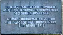 On 10 August 1939, Reinhard Heydrich informed Naujocks of his mission to lead a small group of German operatives to seize the Gleiwitz radio station.[7] Three weeks later, on the night of 31 August, Naujocks led the attack on the German radio station at Gleiwitz, one of twenty-one similar concentrated attacks which the German government quickly attributed to the Poles. Once inside the radio station, a short anti-German message in Polish was broadcast (the precise content of the message is now uncertain). Shots were fired in the studio and a corpse left on the floor near the microphone.[8]