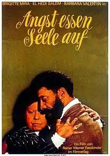 Ali: Fear Eats the Soul (German: Angst essen Seele auf, lit. 'Fear Eat Soul Up') is a 1974 West German film written and directed by Rainer Werner Fassbinder, starring Brigitte Mira and El Hedi ben Salem. The film won the International Federation of Film Critics award for best in-competition movie and the Prize of the Ecumenical Jury at the 1974 Cannes Film Festival.[2] It is considered to be one of Fassbinder's most powerful works and is hailed by many as a masterpiece.