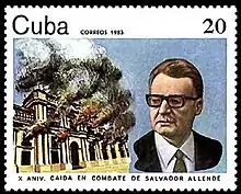Two other stamps, both on the tenth anniversary of the coup, represent extremes of reaction to the event. Scott Cuba #2605 shows the burning presidential palace of La Moneda ("The Mint") and a picture of Allende. The caption refers to him as having "fallen in combat".