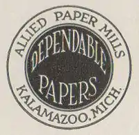 Allied Paper Mills was incorporated in Kalamazoo, Michigan, USA during 1921 when three local paper companies merged. These were the Monarch Paper Company in Kalamazoo, the King Paper Company in Kalamazoo and the Bardeen Paper Company in Otsego. The combined output of 10 paper machines and 34 coating machines immediately placed the Allied Paper Mills in the top producers of book paper in the nation. When operating at full speed and full capacity it was expected that between 1200 and 1800 people would be given employment. A. L. Pratt was selected as company President, and A. G. Gilman and George H. Gerpheide were the vice presidents. George B. Davis was the secretary and S. B. Monroe the treasurer.[1] The new corporation was capitalized at 5,000,000 preferred shares and 5,000,000 shares of no-par value common stock.[2]