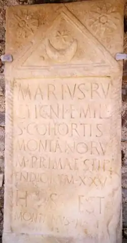 The name of Montanorum cohorts derives from Montani (literally, "mountain people"), apparently a generic term for tribes inhabiting the eastern Alps, both from eastern Raetia and Noricum.[46]