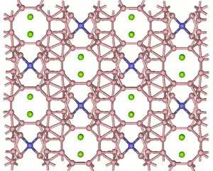Most superhard materials have simple, high-symmetry crystal structures, e.g., diamond cubic or zinc blende. However, BAM has a complex, low-symmetry crystal structure with 64 atoms per unit cell. The unit cell is orthorhombic and its most salient feature is four boron-containing icosahedra. Each icosahedron contains 12 boron atoms. Eight more boron atoms connect the icosahedra to the other elements in the unit cell. The occupancy of metal sites in the lattice is lower than one, and thus, while the material is usually identified with the formula AlMgB14, its chemical composition is closer to Al0.75Mg0.75B14.[7][8] Such non-stoichiometry is common for borides (see crystal structure of boron-rich metal borides and boron carbide). The unit cell parameters of BAM are a = 1.0313 nm, b = 0.8115 nm, c = 0.5848 nm, Z = 4 (four structure units per unit cell), space group Imma, Pearson symbol oI68, density 2.59 g/cm3.[5] The melting point is roughly estimated as 2000 °C.[11]