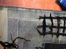 The oldest known amate paper dates back to 75 CE. It was discovered at the site of Huitzilapa, Jalisco. Huitzilapa is a shaft tomb culture site located northwest of Tequila Volcano near the town of Magdalena. The crumpled piece of paper was found in the southern chamber of the site's shaft tomb, possibly associated with a male scribe. Rather than being produced from Trema micrantha, from which modern amate is made, the amate found at Huitzilapa is made from Ficus tecolutensis.[5] Iconography (in stone) dating from the period contains depictions of items thought to be paper. For example, Monument 52 from the Olmec site of San Lorenzo Tenochtitlán illustrates an individual adorned with ear pennants of folded paper.[6] The oldest known surviving book made from amate paper may be the Grolier Codex, which Michael D. Coe and other researchers have asserted is authentic and dated to the 12th-13th century CE.[7]
