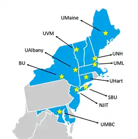 The America East Conference is a collegiate athletic conference affiliated with the NCAA Division I whose members are located in the Northeastern United States. The conference has ten core members including nine public research universities, three of which: University of Maine, University of New Hampshire, and University of Vermont are the flagship universities of their states. Stony Brook University is a member of the AAU. Three of the four university centers of the State University of New York are in the conference: University at Albany, Binghamton University and Stony Brook University. University of Hartford is the only private university. Of the ten members, nine are located within the borders of 7 contiguous states. The tenth, UMBC, is the only institution not bordering other conference institutions. UMass Lowell and NJIT are the latest institutions to join the conference.