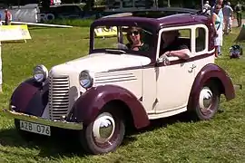 The automobile was designed in the hopes of creating a market for small-car enthusiasts in the United States. The cars had 747 cc (45.6 cu in) inline-four engines, enabling the car to return 40 mpg‑US (48 mpg‑imp; 5.9 L/100 km), and travel 1,000 miles or 1,600 kilometres per 2 US qt (1.7 imp qt; 1.9 l) fill of oil.[4] It was capable of 50 mph (80 km/h) in high gear.[5] Styling resembled small Chevrolets, with Stutz- and Marmon-style horizontal hood louvres. The bodies were designed by Alexis de Sakhnoffsky and made by the Hayes Body Company of Detroit. The coupe was billed as a sedan, and sold for $445, slightly less than a Ford V8 roadster. The Great Depression made the cheaper secondhand cars more appealing, so sales dropped off.