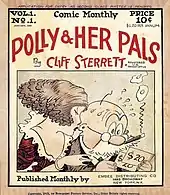 The G. W. Dillingham Company published the first known proto-comic-book magazine in the US, The Yellow Kid in McFadden's Flats, in 1897. A hardcover book, it reprinted material—primarily the October 18, 1896, to January 10, 1897, sequence titled "McFadden's Row of Flats"—from cartoonist Richard F. Outcault's newspaper comic strip Hogan's Alley, starring the Yellow Kid. The 196-page, square-bound, black-and-white publication, which also includes introductory text by E. W. Townsend, measured 5 by 7 inches (130 mm × 180 mm) and sold for 50 cents. The neologism "comic book" appears on the back cover.[10] Despite the publication of a series of related Hearst comics soon afterward,[10] the first monthly proto-comic book, Embee Distributing Company's Comic Monthly, did not appear until 1922. Produced in an 8 1⁄2-by-9-inch (220 mm × 230 mm) format, it reprinted black-and-white newspaper comic strips and lasted a year.[10][11]
