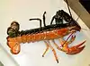 The American lobster (Homarus americanus) is a species of lobster found on the Atlantic coast of North America, chiefly from Labrador to New Jersey. It is also known as Atlantic lobster, Canadian lobster, true lobster, northern lobster, Canadian Reds,[3] or Maine lobster.[4][5] It can reach a body length of 64 cm (25 in), and a mass of over 20 kilograms (44 lb), making it not only the heaviest crustacean in the world, but also the heaviest of all living arthropod species. Its closest relative is the European lobster Homarus gammarus, which can be distinguished by its coloration and the lack of spines on the underside of the rostrum. American lobsters are usually bluish green to brown with red spines, but several color variations have been observed.