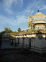 The present masonry structure was built during the Chola dynasty in the 9th century, while later expansions are attributed to Thanjavur Nayaks. The temple has a three-tiered rajagopuram (temple tower gateway) and has a moat both inside and outside its surrounding walls. There is a Saptamatrikas sculpted in a single panel and image of Tapsiviyaman. The Dakshinamurthy sculpture on the temple is unique as it is depicted with four hands - the upper right holding a bead made of Rudraksha, the upper left holding Agni (fire), the lower right holding cinmudra and lower left holding palm leaves. The temple tank associated with it is called Caturveda Tirtha, while the tree associated with the temple is Vanni. The presiding deity is Shiva in the form of Amirthakalasanathar or Amirthakadeswarar. The consort is Amirthavalli. Most of the shrines were constructed by the Medieval Cholas. There are shrines to Murugan and Ganesa. There is also a brick halls from the Thanjavur Nayak period.[2] The image of Lingothbhava is made of emerald, while the image of Ardhanarishvara is depicted with his right leg in relaxing posture. There are smaller shrines for Dhandapani Muruga in a small size and Nardana Vinayaka on the southern side. The front hall houses the Nandi Bali Peeta.[3]